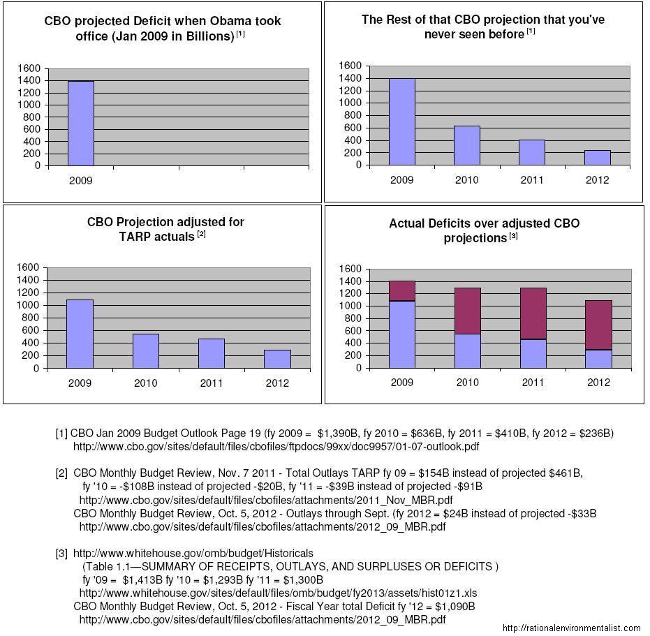 I did a quick comparison between the CBO's 2009 Deficit Projection to the Actual Deficits including Net TARP expenditures and repayment here.